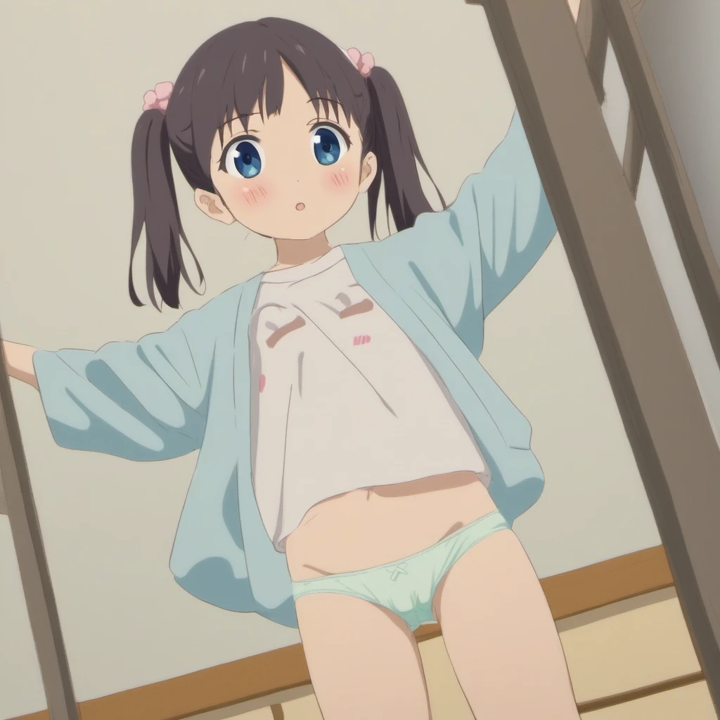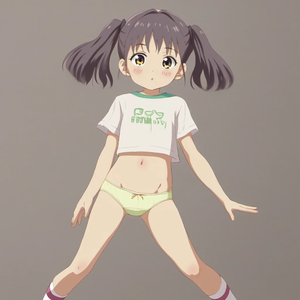 - positive: score_7_up,NSFW, (1girl), (kyoto animation), (12yo), tareme, (cute girl), (pink twintails hair:1.5), childish, (small titty), (radio gymnastics),(childish girly bra:1.2), (childish girly panties:1.2),